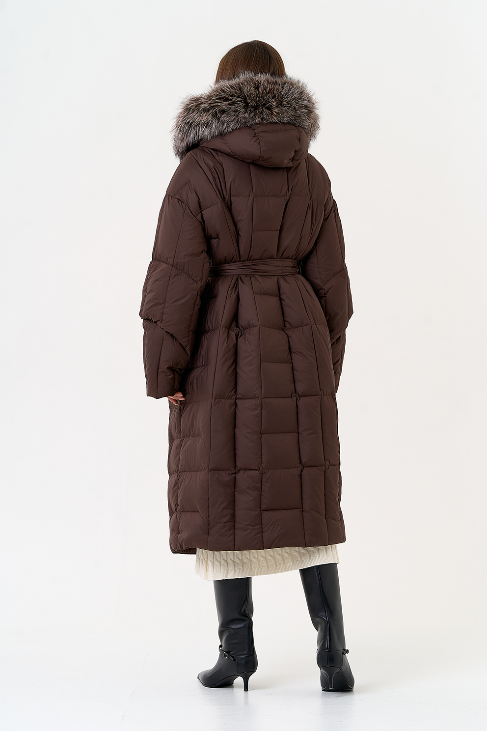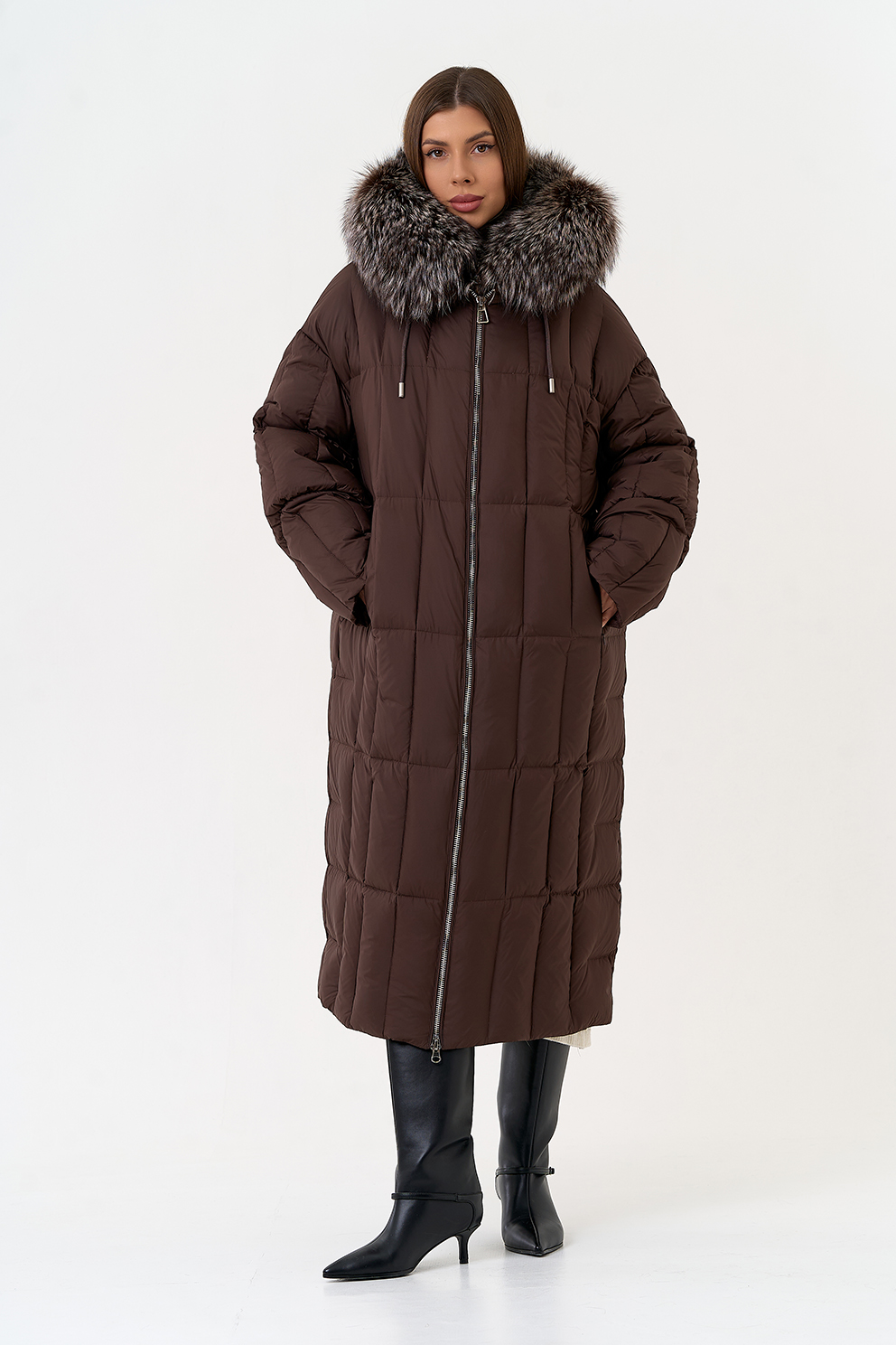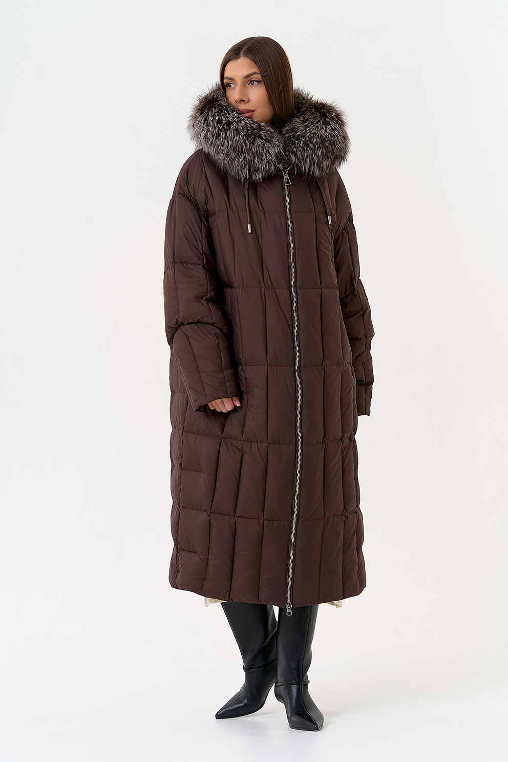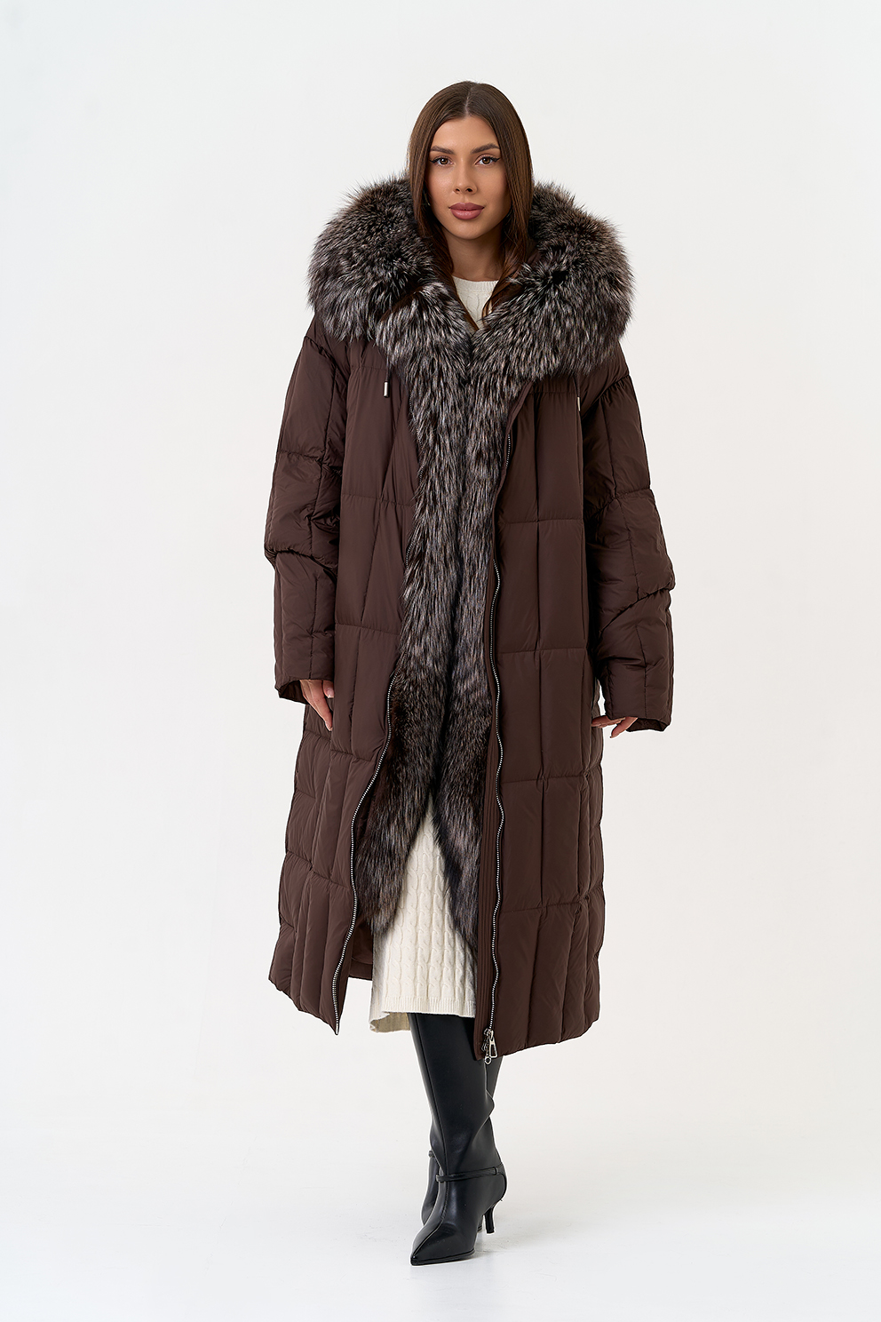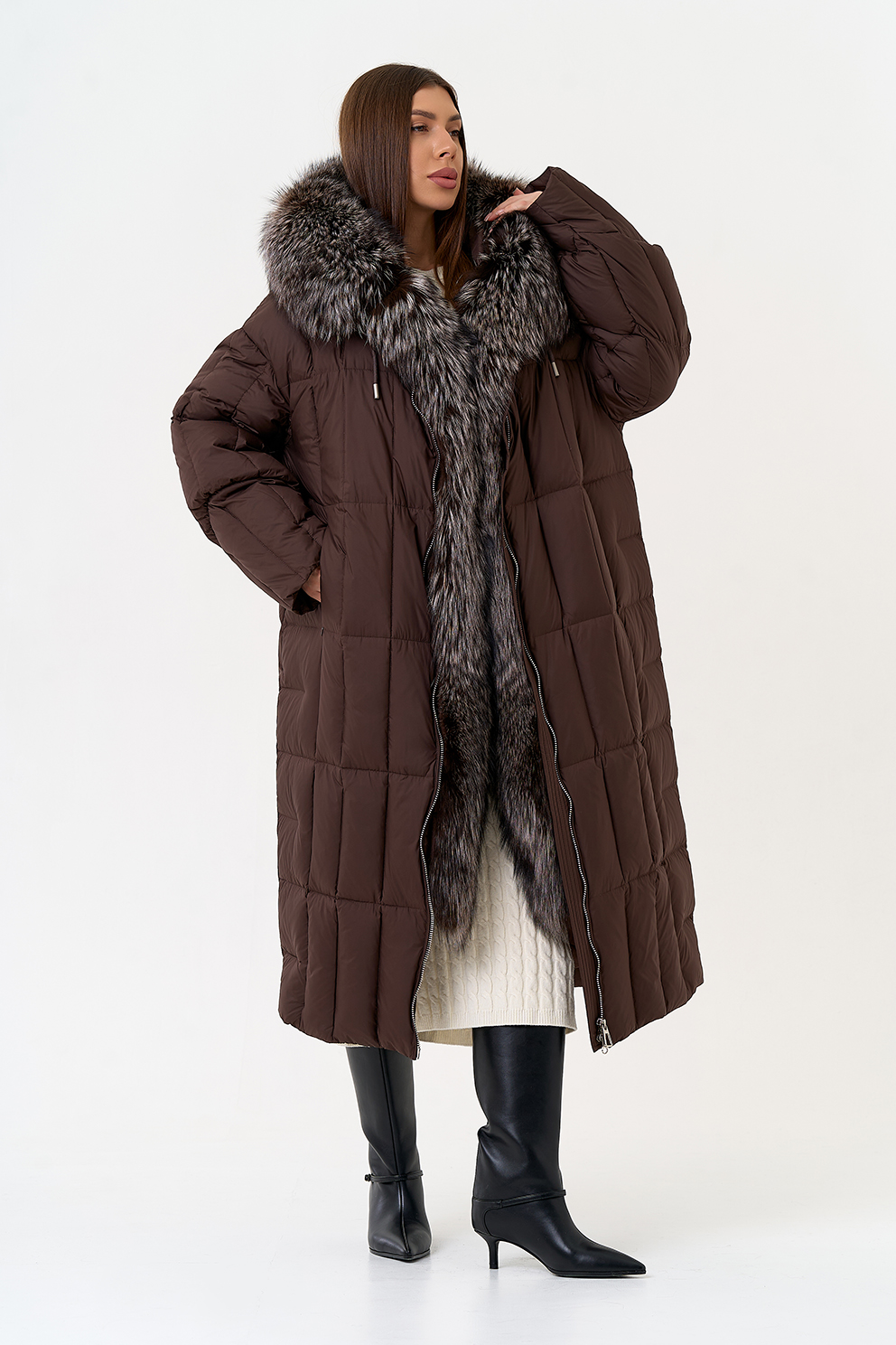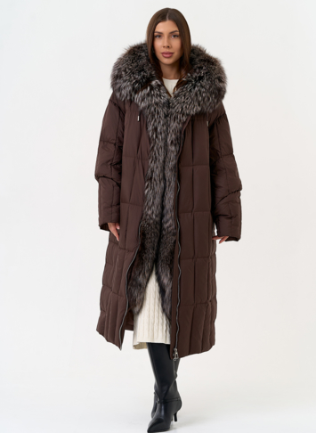 Крой воротника - капюшон, отделка чернобурая лиса