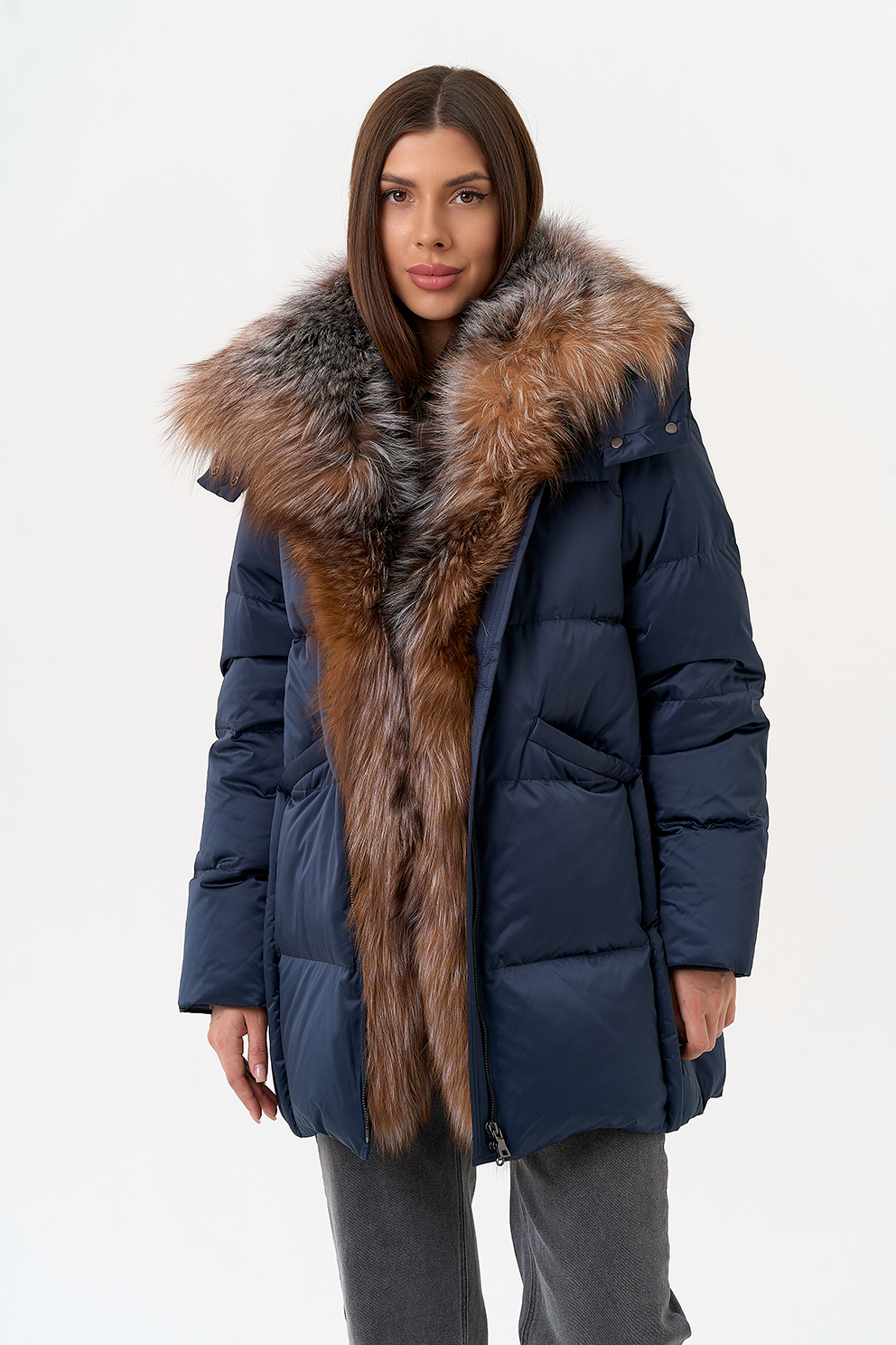 Крой воротника - капюшон, отделка блюфрост