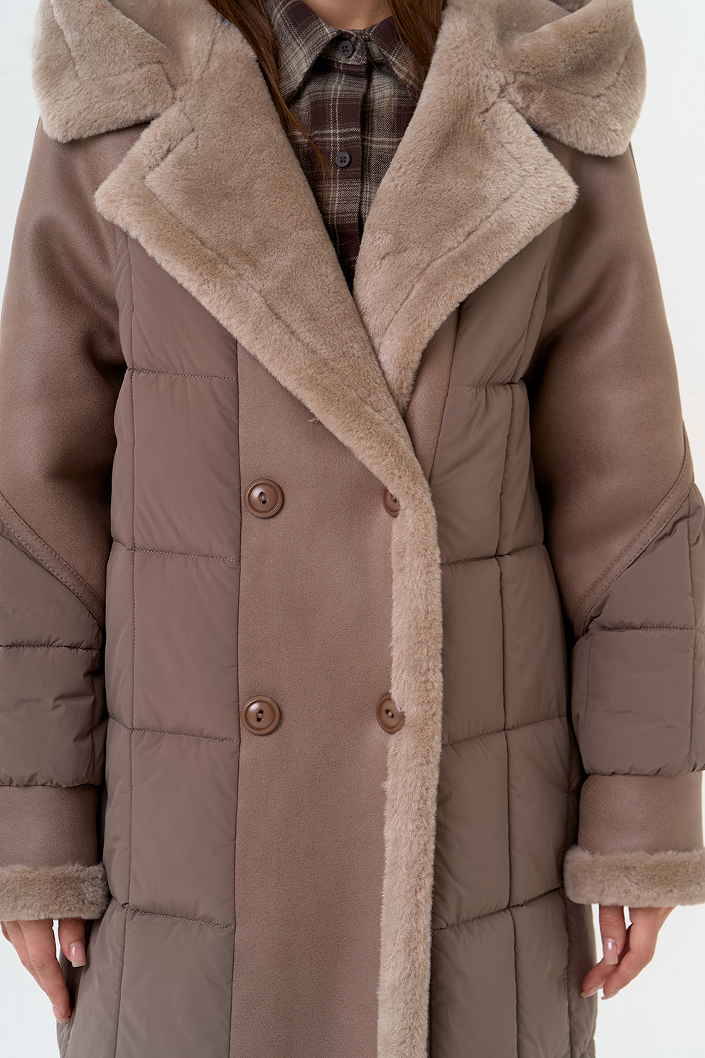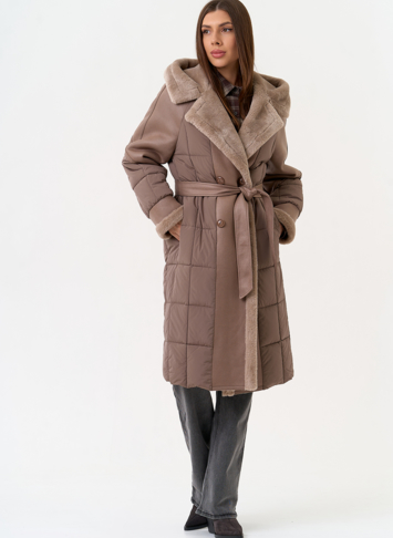 Крой воротника - капюшон, отделка эко мех